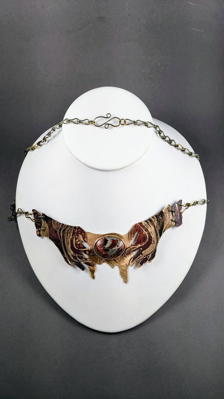 The theme of this project was blood bond magic, the two hand cut outs are soldered to a drip shaped piece of metal holding the bezel. The red of the stone matches the patina and gives the pendant a sense of unity. This design choice was made to make it look like blood was coming from the hands and into the stone, I drew inspiration for this project from the Order of the Phoenix in the Harry Potter series. The unbreakable bond in the series was much different than this project but it was the concept that I drew from. The hands and center piece are textured with a flowy design that has been etched into the brass. The etched design is flowing toward the bezel set stone drawing your eyes to the middle of the pendant.