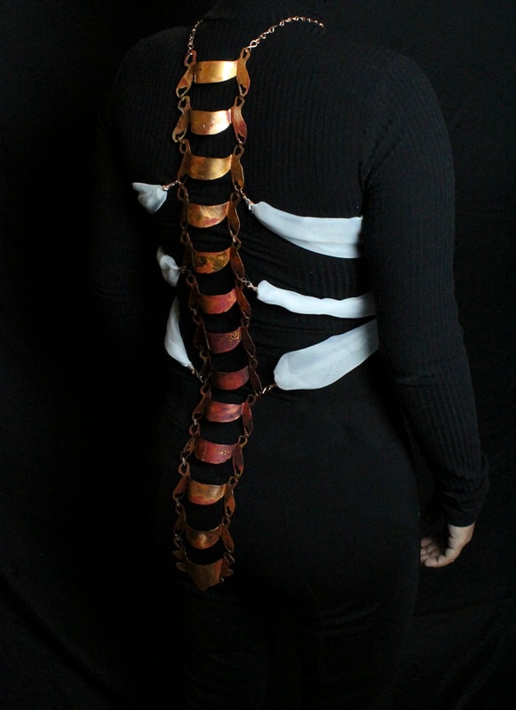 Lumbago: This spine has a dark red patina surrounding the areas I experience the most pain. A gradient out from the lower part of my spine.